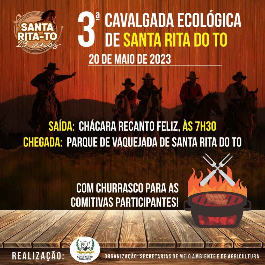 A Prefeitura de Santa Rita do Tocantins, na região Sul do Estado, realiza neste sábado, 20, a 3ª Cavalgada Ecológica de Santa Rita do TO, a partir das 7h30, com saída da Chácara Recanto Feliz e chegada no Parque de Vaquejada Nilo Reis, na zona urbana da cidade. A programação integra as comemorações pelos 29 anos da cidade, registrado no dia 26 de maio.