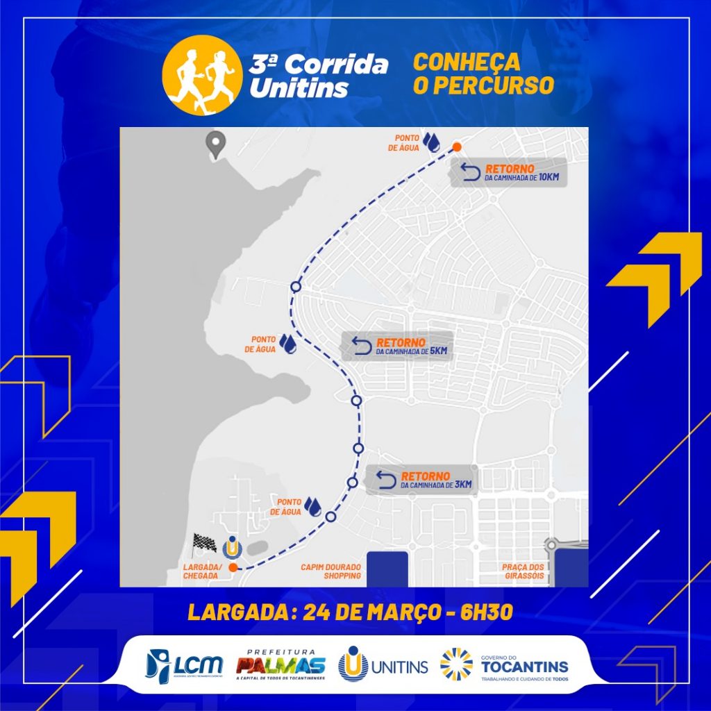 A 3ª Corrida Unitins abre o circuito das Corridas de Rua da capital e é organizada pela Diretoria de Assuntos Estudantis e Esporte da Unitins, vinculada à Pró-Reitoria de Extensão, Cultura e Assuntos Comunitários (Proex), em parceria com a LCM Gestão e Treinamento Esportivo e com apoio da Prefeitura Municipal de Palmas.