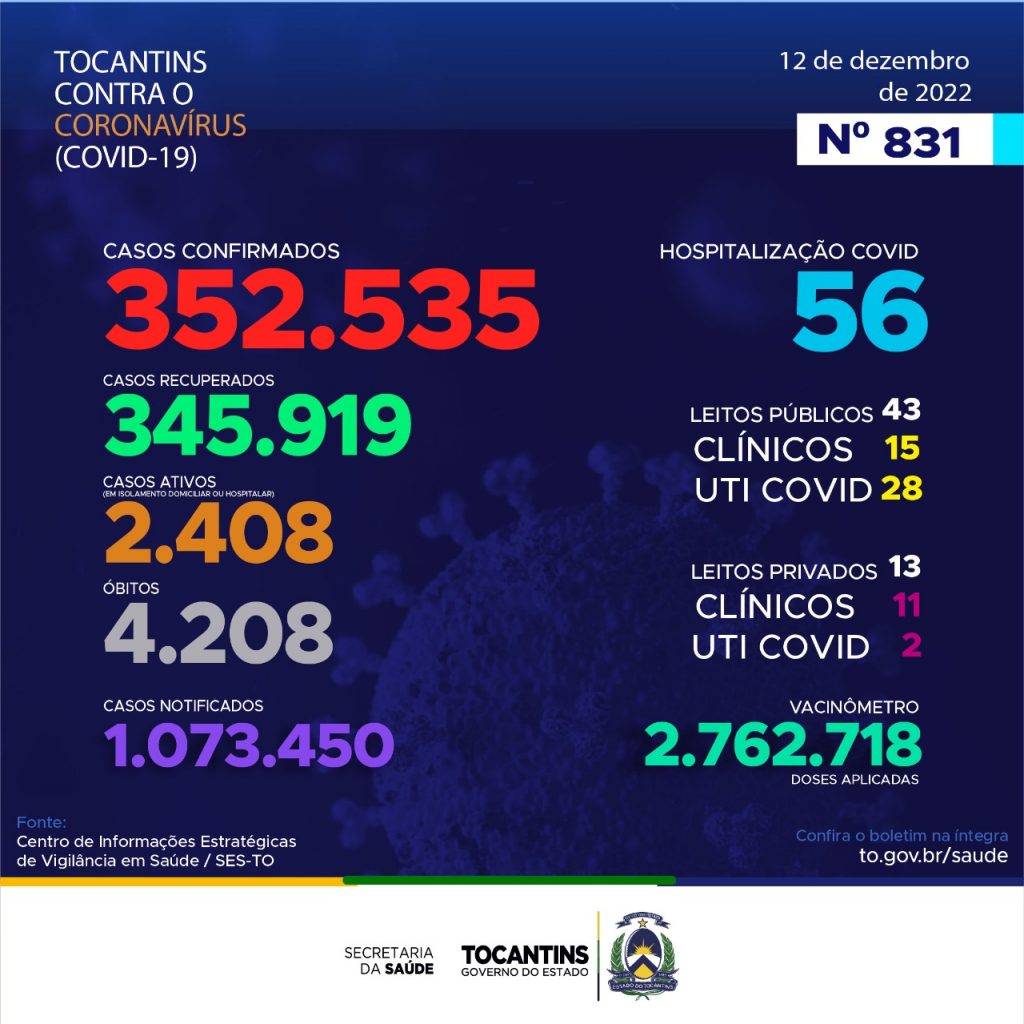 Atualmente, o Tocantins contabiliza 1.073.450 pessoas notificadas com a Covid-19 acumula 352.535 casos confirmados. Destes 345.919 estão recuperados, 2.408 pacientes seguem em isolamento domiciliar ou hospitalar e 4.208 foram a óbito.