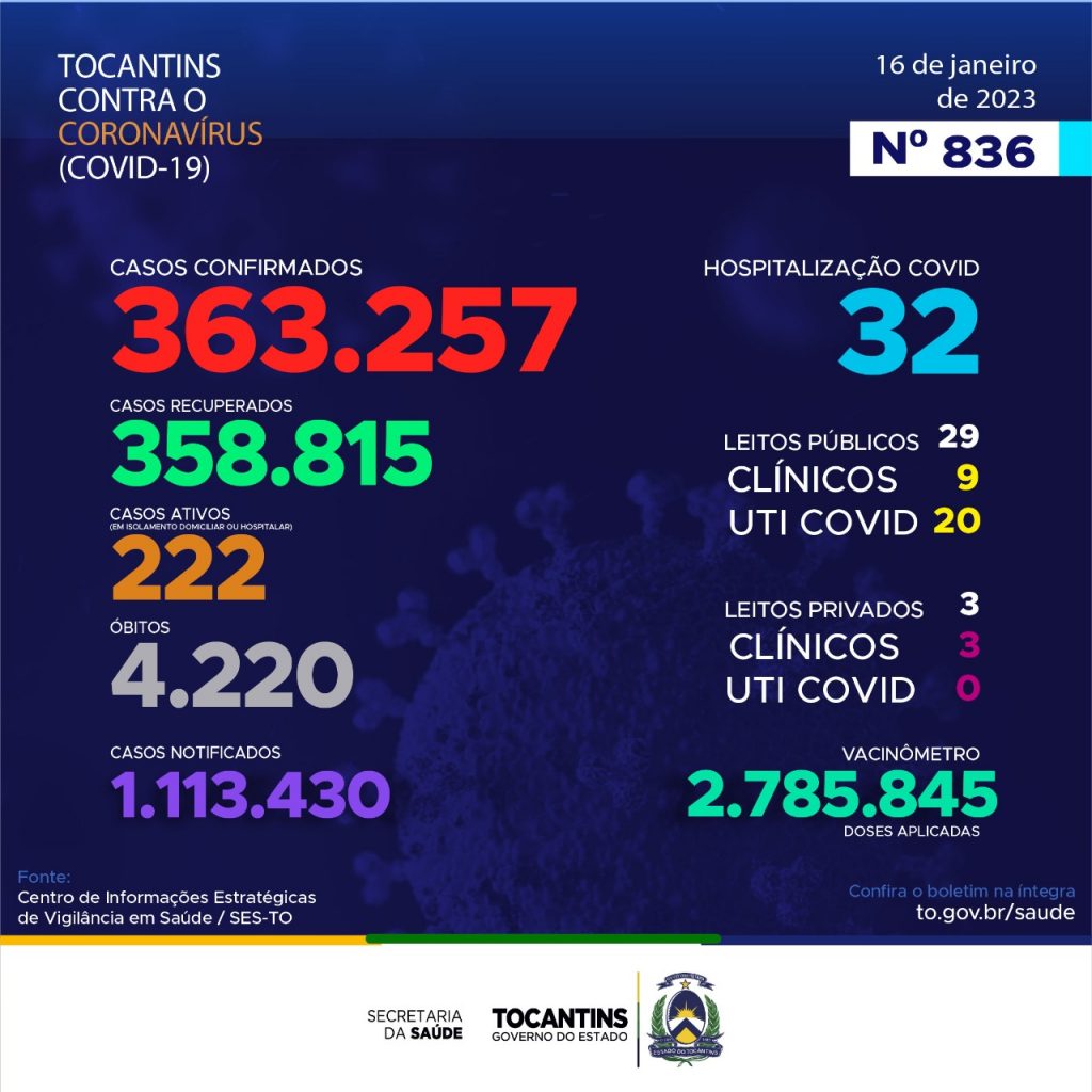 Atualmente, o Tocantins contabiliza 1.113.430 pessoas notificadas com a Covid-19 acumula 363.257 casos confirmados. Destes 358.815 estão recuperados, 222 pacientes seguem em isolamento domiciliar ou hospitalar e 4.220 foram a óbito.