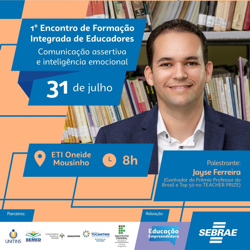 Para fortalecer a cultura empreendedora nas escolas e desenvolver competências integradas à construção de projetos de vida dos educadores e estudantes, o Sebrae e Instituições de Ensino do Tocantins realizam o I Encontro de Formação Integrada de Educadores. Os participantes contarão com a palestra magna “Inteligência Emocional na Comunicação Assertiva no contexto escolar”, ministrada pelo escritor Jayse Ferreira.