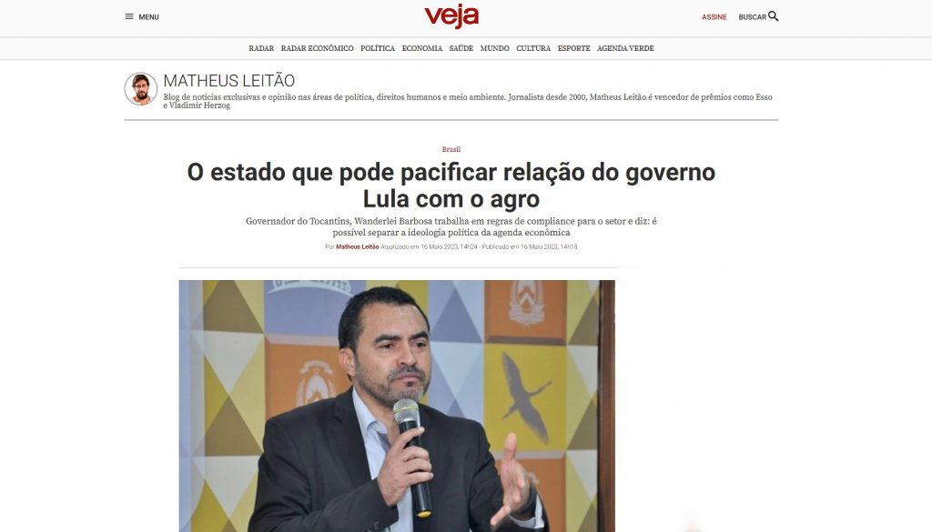Na manchete do portal Veja, ficou evidente a posição do Governador do Tocantins em relação ao agro, que é a de ser um conciliador sobre as demandas do setor com a atual administração do Governo Federal. “É possível separar a ideologia política da agenda econômica”, afirmou Wanderlei Barbosa, referindo-se à produção do agronegócio, que é um dos grandes pilares que movem a economia nacional.
