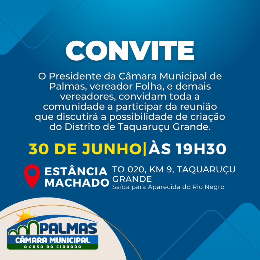 Na próxima sexta-feira (30), a Câmara Municipal de Palmas (CMP) realizará, a partir das 19h30, uma reunião pública para discutir junto à comunidade a possibilidade de criação do distrito de Taquaruçu Grande. A reunião foi proposta pelo presidente da Casa de Leis, vereador Folha (PSDB) e ocorrerá no espaço Estância Machado, localizado na TO-020, KM 9, saída para Aparecida do Rio Negro.