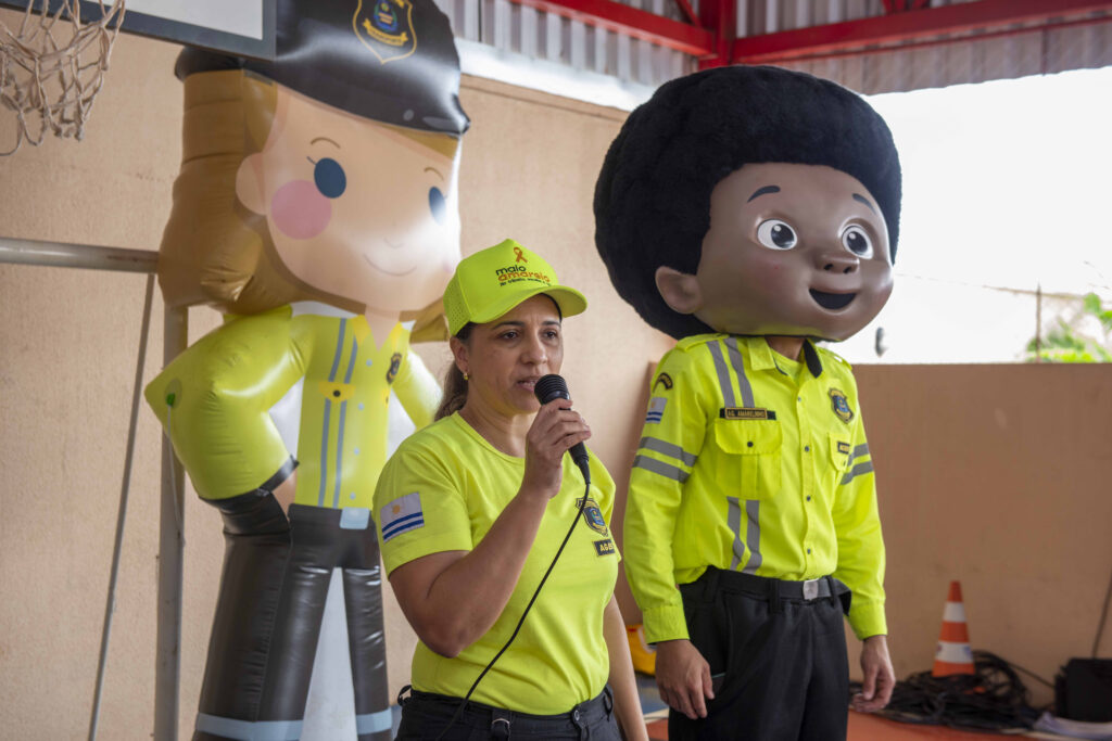 Na pista da quadra foi instalada uma faixa de pedestre, onde os alunos simularam a travessia na faixa de forma segura, com a orientação dos agentes, servidores da escola e do mascote ‘amarelinho’, que deixou a garotada eufórica.