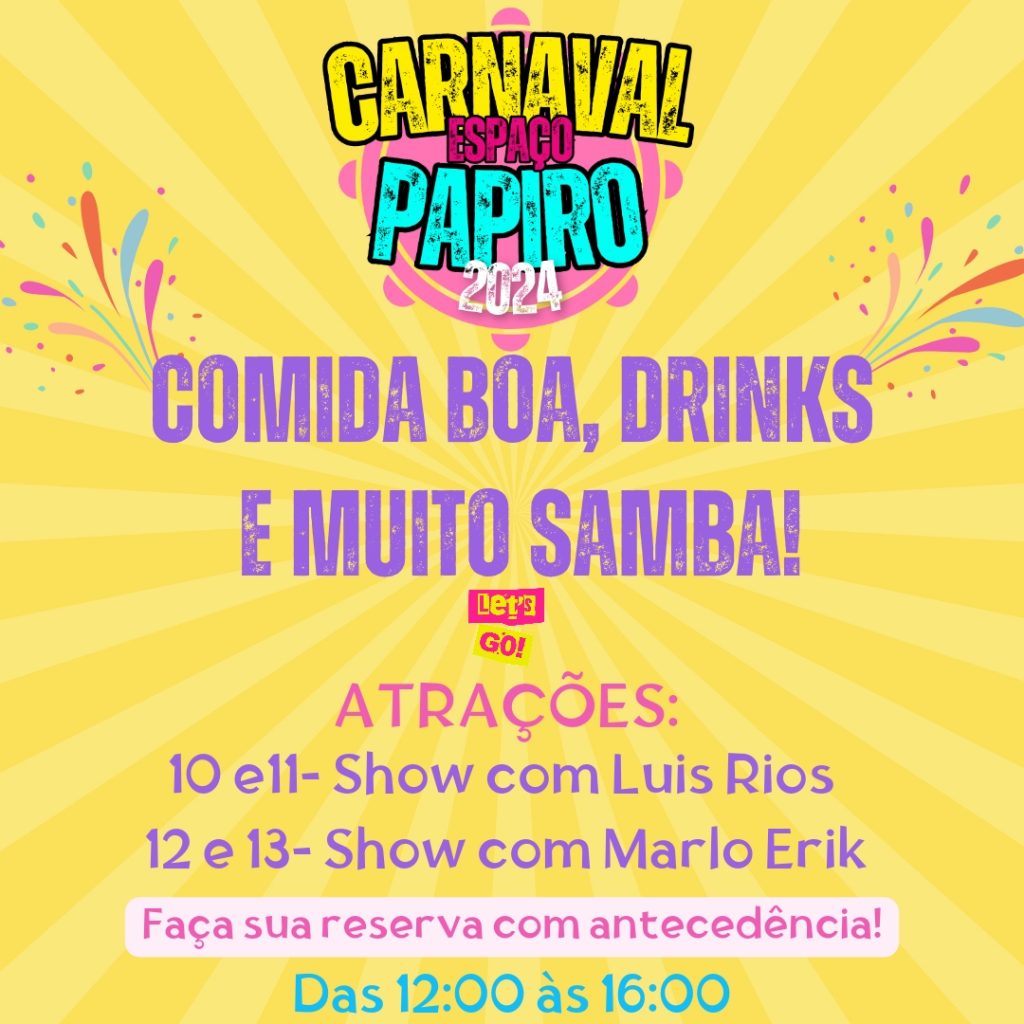 O Espaço Papiro se prepara para receber uma das mais vibrantes celebrações deste ano: o Carnaval Espaço Papiro 2024. Com um slogan que já anuncia a energia do evento — “COMIDA BOA, DRINKS E MUITO SAMBA!” —, os organizadores prometem uma festa que vai muito além do convencional.