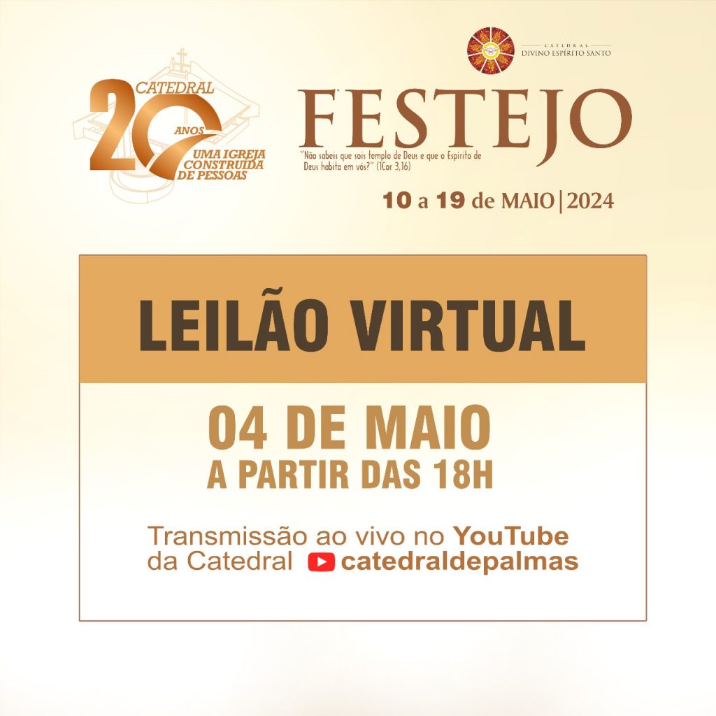 O Festejo da Catedral começa oficialmente na próxima sexta-feira, 10/05, mas a primeira atração das festividades do padroeiro da paróquia, o Divino Espírito Santo, já será realizada no sábado, 4 de maio. É o leilão virtual do Divino, transmitido ao vivo no canal da Catedral no YouTube, a partir das 18h. O link é: https://www.youtube.com/watch?