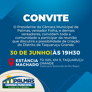 Na próxima sexta-feira (30), a Câmara Municipal de Palmas (CMP) realizará, a partir das 19h30, uma reunião pública para discutir junto à comunidade a possibilidade de criação do distrito de