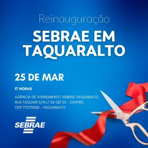 Inauguração ocorre na próxima segunda-feira, 25, na região sul de Palmas O Sebrae Tocantins inaugura esta segunda-feira, 25, a Agência de Atendimento em Taquaralto, região sul de Palmas. O espaço,