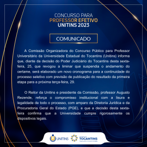 A Comissão Organizadora do Concurso Público para Professor Universitário da Universidade Estadual do Tocantins (Unitins) anunciou hoje que, após uma decisão proferida pelo Poder Judiciário do Tocantins nesta sexta-feira, 25,