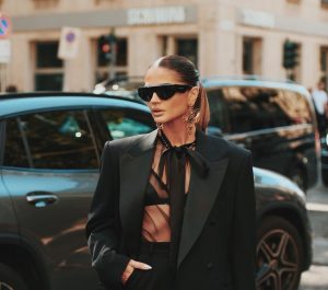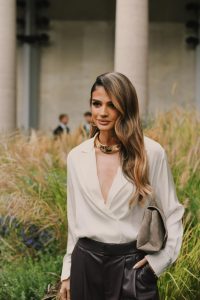 Em seu segundo dia na semana de moda, a comunicadora Thássia Naves, que ontem participou do desfile da FENDI, desta vez com um uma camisa branca clássica e calça de