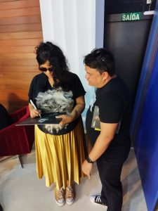 O jornalista Wherbert Araújo tietando a cantora Tulipa Ruiz que faz show nesta sexta-feira (10) na inauguração da Comics Pub do artista tocantinense Paulo Vieira.