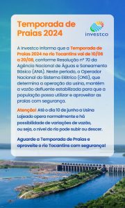 A Investco, em conformidade com a Resolução ANA nº 70, de 19 de abril de 2021, informa que a temporada de praias 2024 no rio Tocantins ocorrerá entre os dias