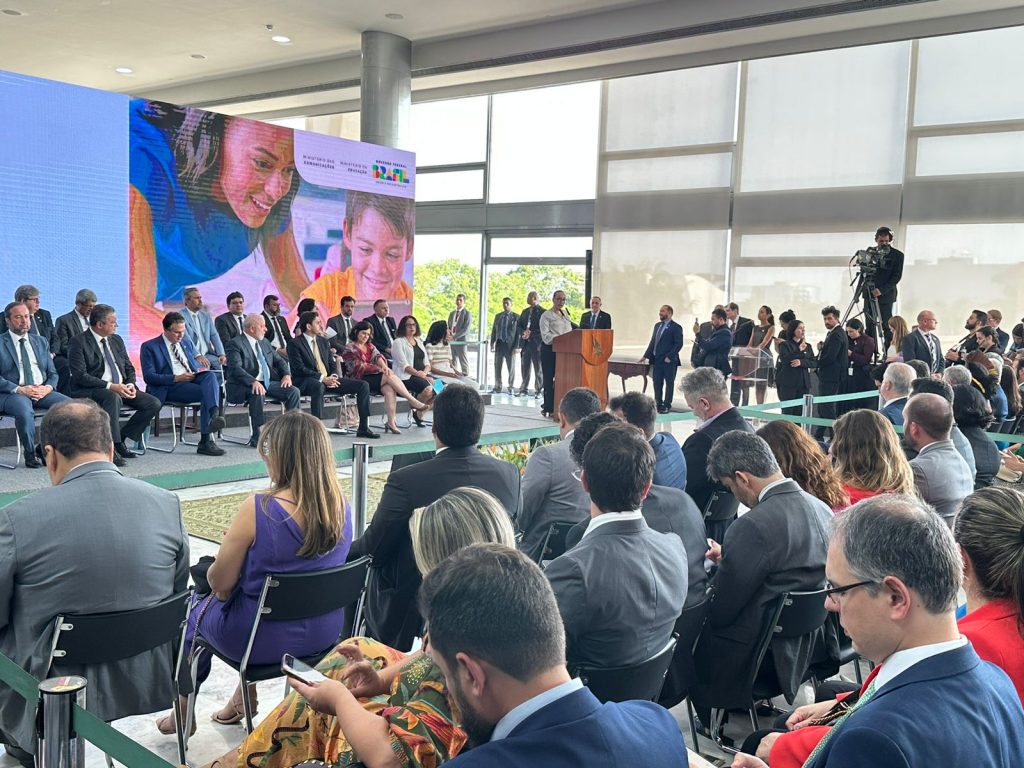 Ao lado do presidente da República, Luiz Inácio Lula da Silva, e dos ministros de Estado das Comunicações, Juscelino Filho, e da Educação, Camilo Santana, e demais autoridades, a prefeita de Palmas, Cinthia Ribeiro, participou nesta terça-feira, 26, do lançamento da Estratégia Nacional de Escolas Conectadas.