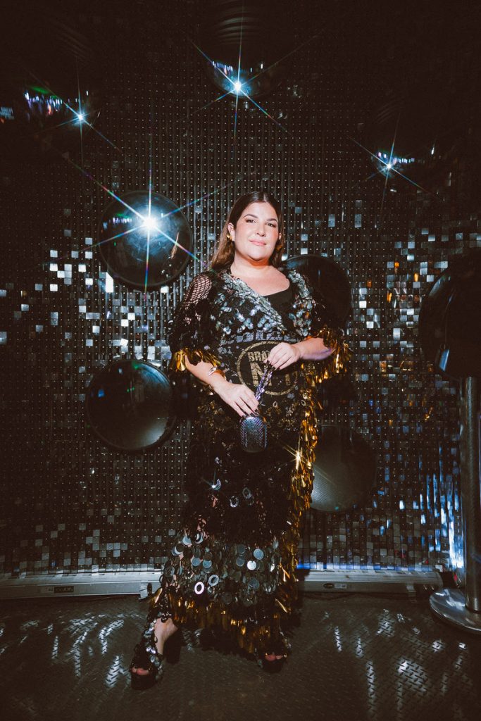 Assinada pela marca brasileira Gustavo Silvestre e com expertise da stylist Joana Wood, vestido que traz referências aos modelitos de Carmen Miranda é coberto por paetês pretos e composição de penas douradas