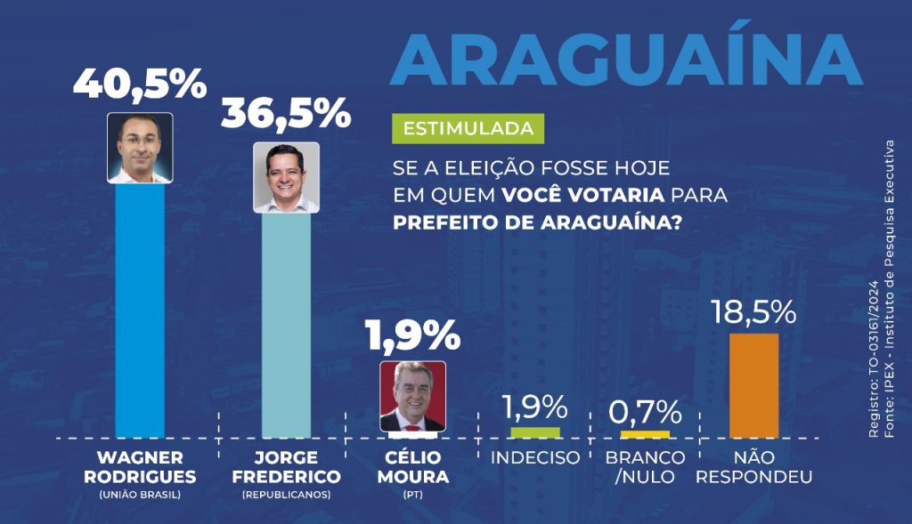 Em nova pesquisa divulgada pelo Instituto de Pesquisa Executiva (IPEX), o pré-candidato a prefeito de Araguaína, Jorge Frederico (Republicanos), está tecnicamente empatado com o atual prefeito da cidade, Wagner Rodrigues (União Brasil).