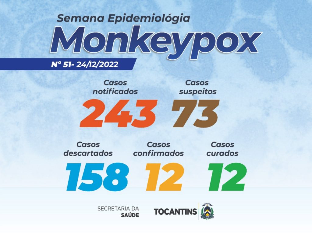 Nesta segunda-feira, 26, a Secretaria de Estado da Saúde (SES-TO) divulgou a atualização dos dados da Monkeypox, no Tocantins. Abaixo, levantamento do Centro de Informações Estratégicas de Vigilância em Saúde (CIEVS-TO), até 24 de dezembro de 2022: