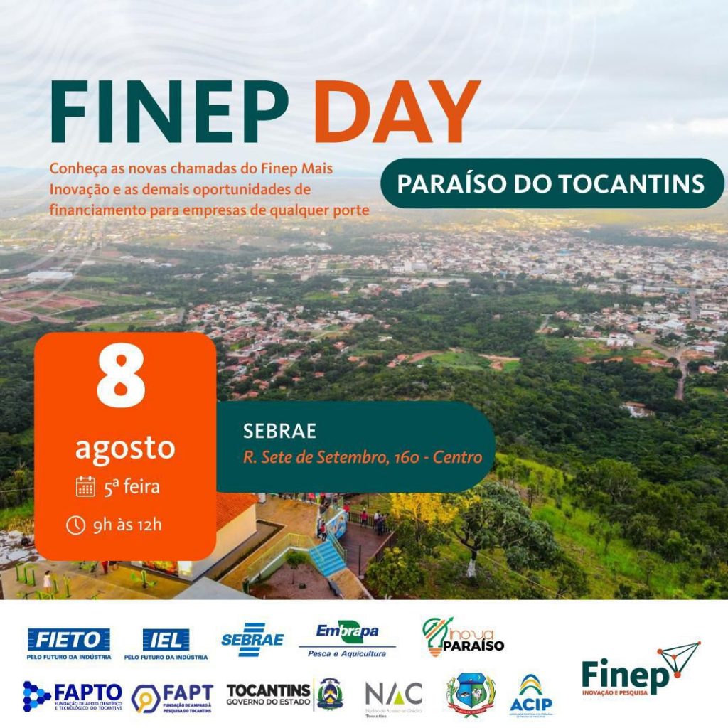 O Sebrae e a Financiadora de Estudos e Projetos (Finep), agência vinculada ao Ministério da Ciência, Tecnologia e Inovação, realizam no próximo dia 08, em Paraíso do Tocantins, a partir das 9 horas, no auditório da instituição, o Finep Day. O evento tem o objetivo de levar informações sobre opções de crédito subsidiado pelo Governo Federal e crédito de subvenção econômica para inovação, com benefícios as micro e pequenas empresas, startups e projetos acadêmicos.
