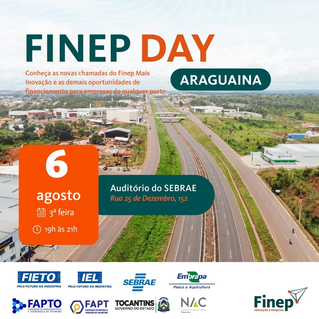 O Sebrae e a Financiadora de Estudos e Projetos (Finep), agência vinculada ao Ministério da Ciência, Tecnologia e Inovação, realizam nesta terça-feira, 06, em Araguaína, norte do Estado, a partir das 9 horas, no auditório da instituição, o Finep Day. O evento tem o objetivo de levar informações sobre opções de crédito subsidiado pelo Governo Federal e crédito de subvenção econômica para inovação, com benefícios as micro e pequenas empresas, startups e projetos acadêmicos.