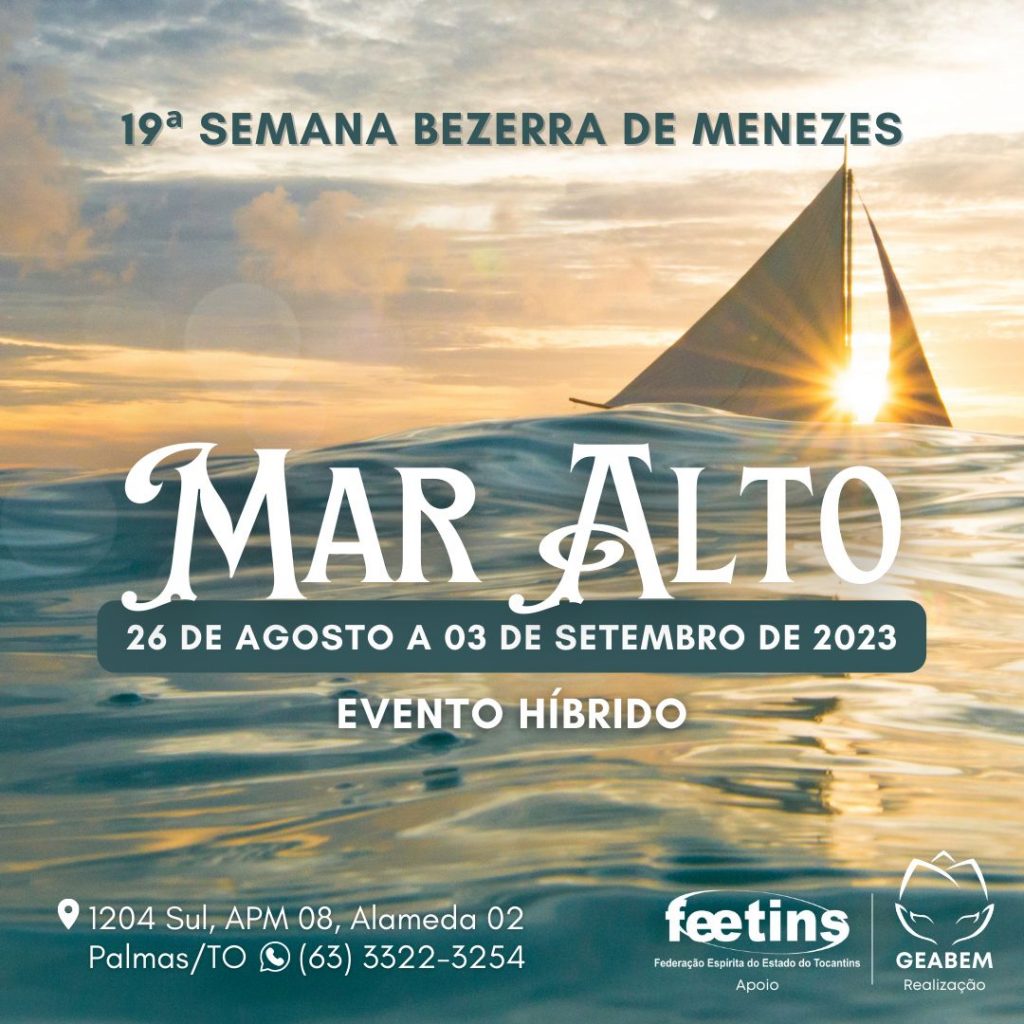 A 19ª Semana Bezerra de Menezes tem entrada gratuita e acontece entre os dias 26 de agosto a 3 de setembro, nos formatos presencial e online. A programação presencial ocorrerá no Grupo Espírita Adolfo Bezerra de Menezes (1204 Sul, APM 08, Alameda 02 – Palmas/TO).