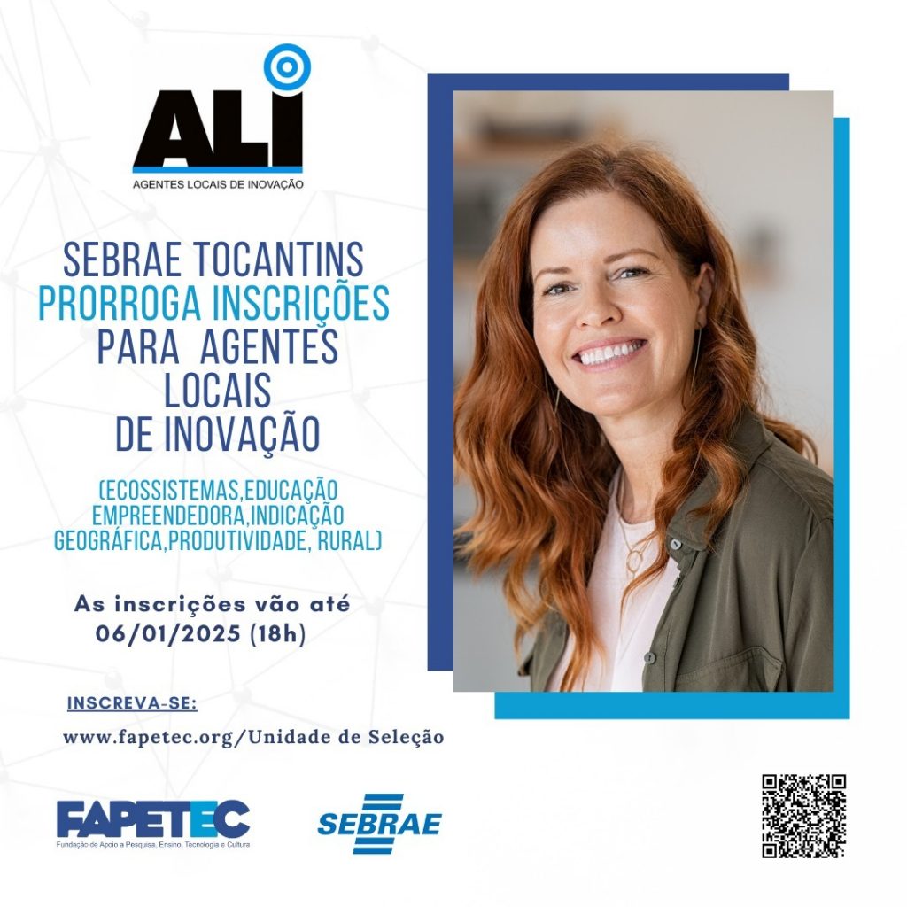 As inscrições para as novas vagas de Agente Local de Inovação (ALI) foram prorrogadas até às 18 horas do dia 06 de janeiro de 2025. As oportunidades são para todas as metodologias do programa: Ecossistemas, Educação Empreendedora, Indicação Geográfica, Produtividade, além novamente, da Rural, desta vez para mais localidades do Estado.