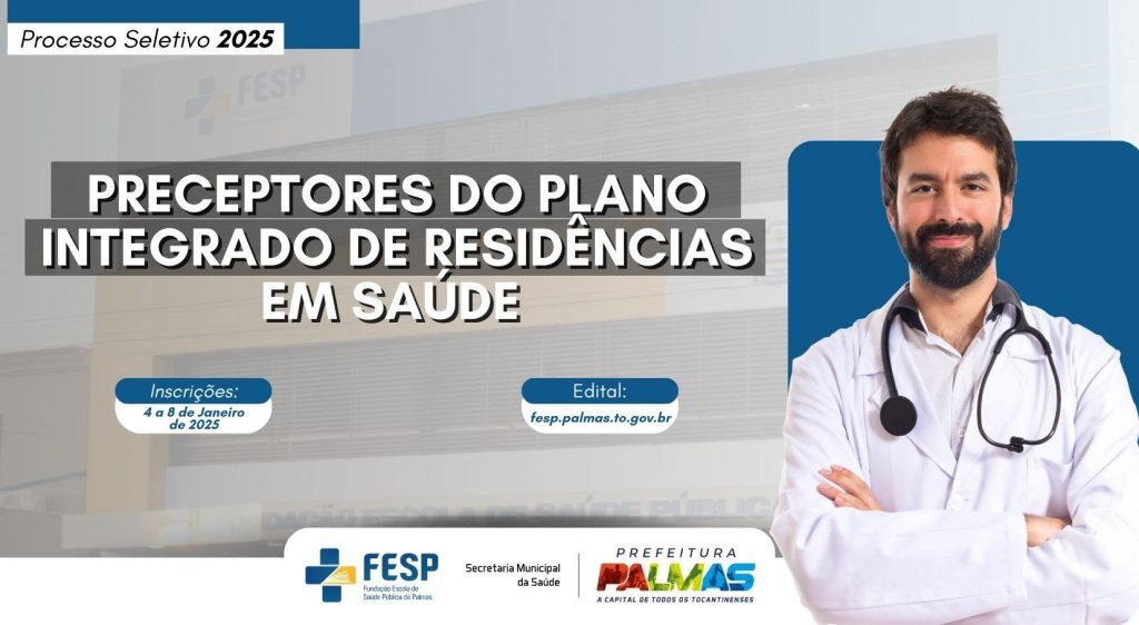 A Fundação Escola de Saúde Pública de Palmas (Fesp) abre neste sábado, 4, as inscrições para o processo seletivo para preceptores do Programa de Residência em Medicina de Família e Comunidade (PRMFC), no âmbito do Plano Integrado de Residências em Saúde (PIRS). As inscrições são gratuitas e serão feitas, exclusivamente, pela internet por meio deste link, até a próxima quarta-feira, 8.
