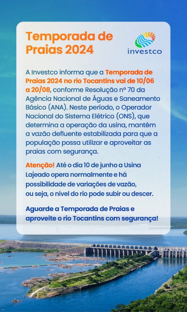 A Investco, em conformidade com a Resolução ANA nº 70, de 19 de abril de 2021, informa que a temporada de praias 2024 no rio Tocantins ocorrerá entre os dias 10 de junho e 20 de agosto de 2024.