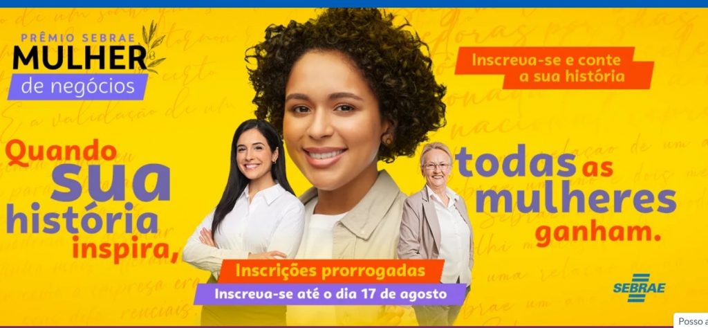 As inscrições do Prêmio Sebrae Mulher de Negócios 2024 vão até o dia 17 de agosto. O Sebrae prorrogou as inscrições do prêmio que tem o objetivo de dar visibilidade e reconhecimento às empreendedoras brasileiras. As interessadas podem se inscrever gratuitamente por meio do preenchimento do formulário eletrônico disponibilizado na página do Prêmio Sebrae Mulher de Negócios (PSMN), no http://www.sebrae.com.br/ premiomulherdenegocios. Segundo o edital, podem concorrer ao prêmio, empresas abertas até o dia 1° de janeiro de 2023.