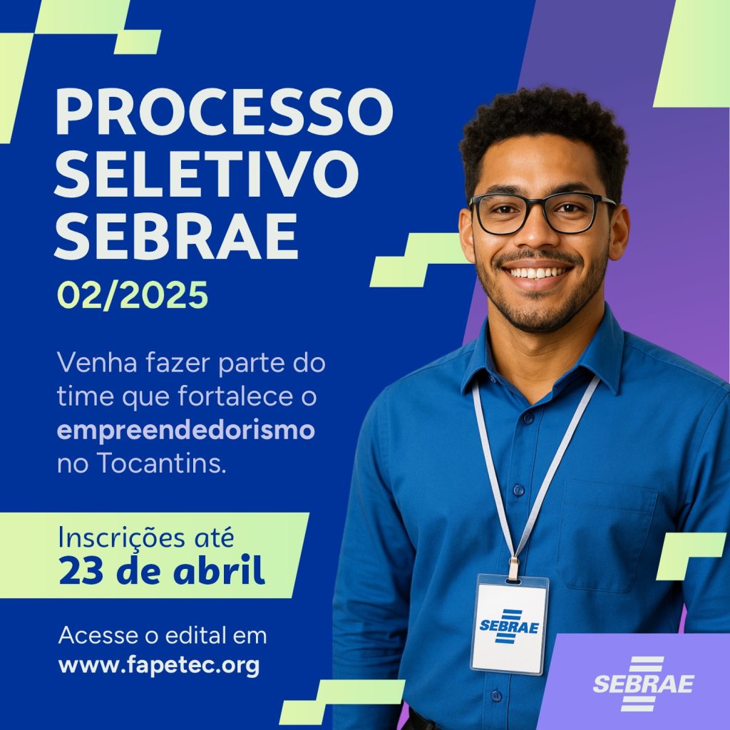 om inscrições abertas até o dia 23 de abril, o Sebrae Tocantins abre processo seletivo para contratação de Analistas Técnicos I. A seleção, conduzida pela Fundação de Apoio à Pesquisa, Tecnologia e Cultura (Fapetec), oferece vagas em Palmas e Dianopólis.