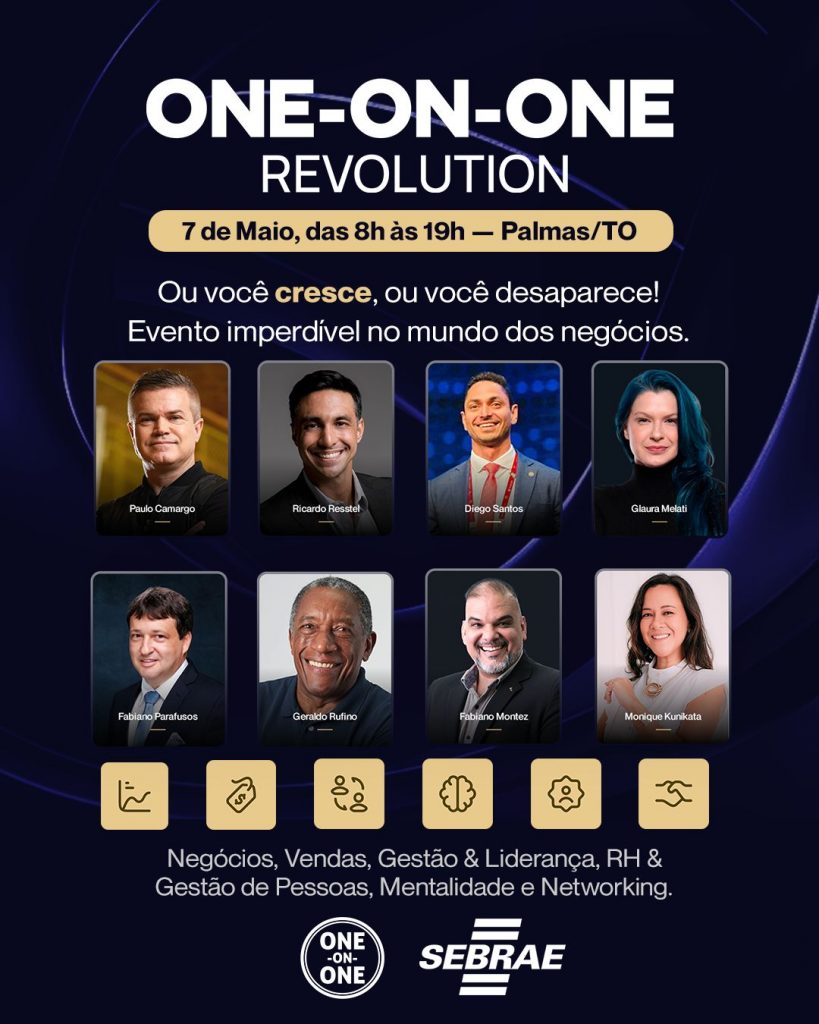 O Sebrae Tocantins apoia o ONE-ON-ONE Revolution, uma imersão profunda em estratégias de negócios, vendas, liderança e diversos conceitos no universo empreendedor. O evento ocorre no dia 07 de maio, próxima terça-feira, no Auditório CDL Palmas, às 8 horas. Com objetivo de equipar os participantes com as ferramentas, insights e a determinação necessária para elevar seus negócios e carreiras a novos patamares de sucesso.
