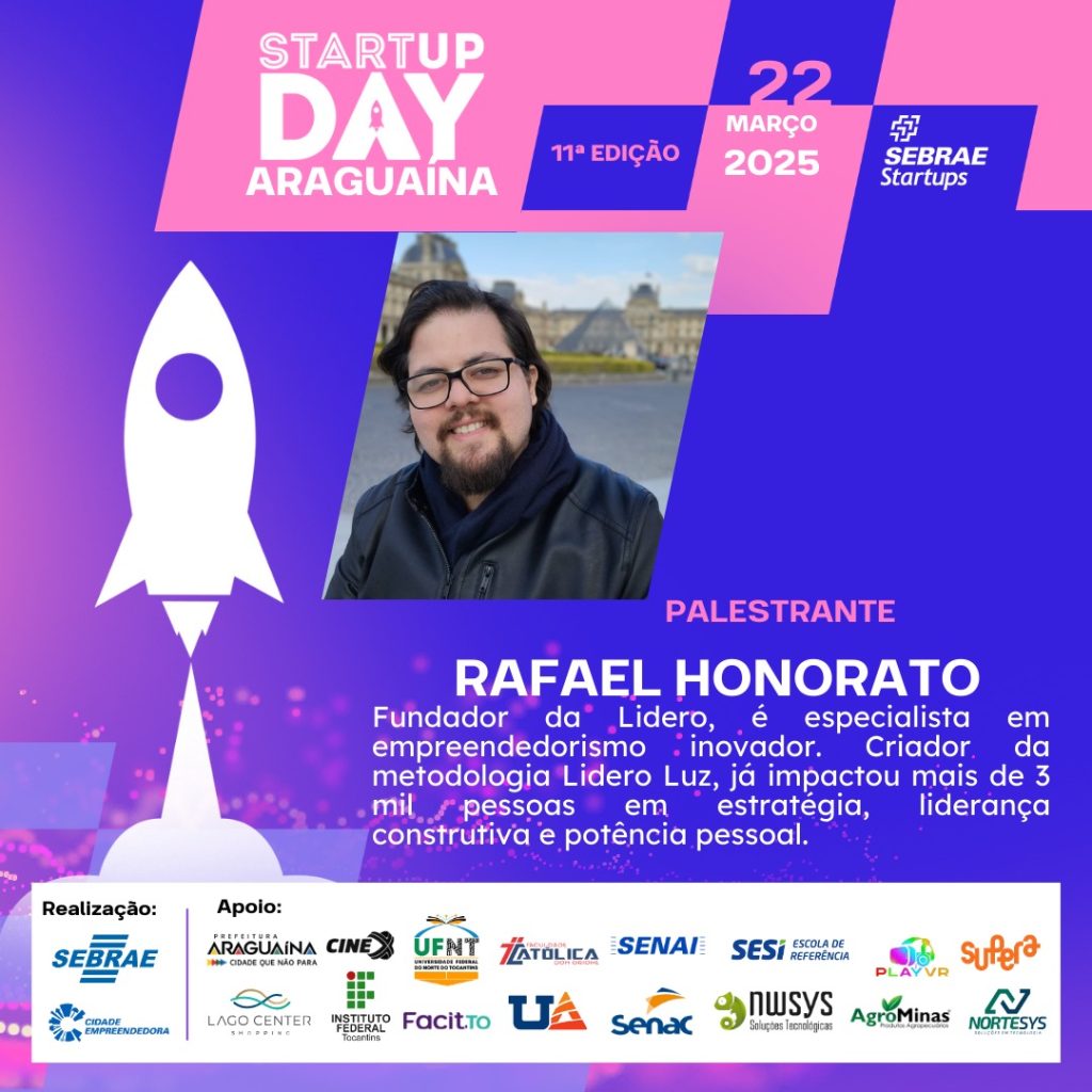 Entre os destaques da edição de Araguaína está a palestra de Rafael Honorato, fundador da Lídero e especialista em empreendedorismo inovador. O especialista, que é criador da metodologia Lídero Luz, atendeu mais de 3 mil pessoas com suas estratégias voltadas para liderança construtiva e desenvolvimento pessoal.