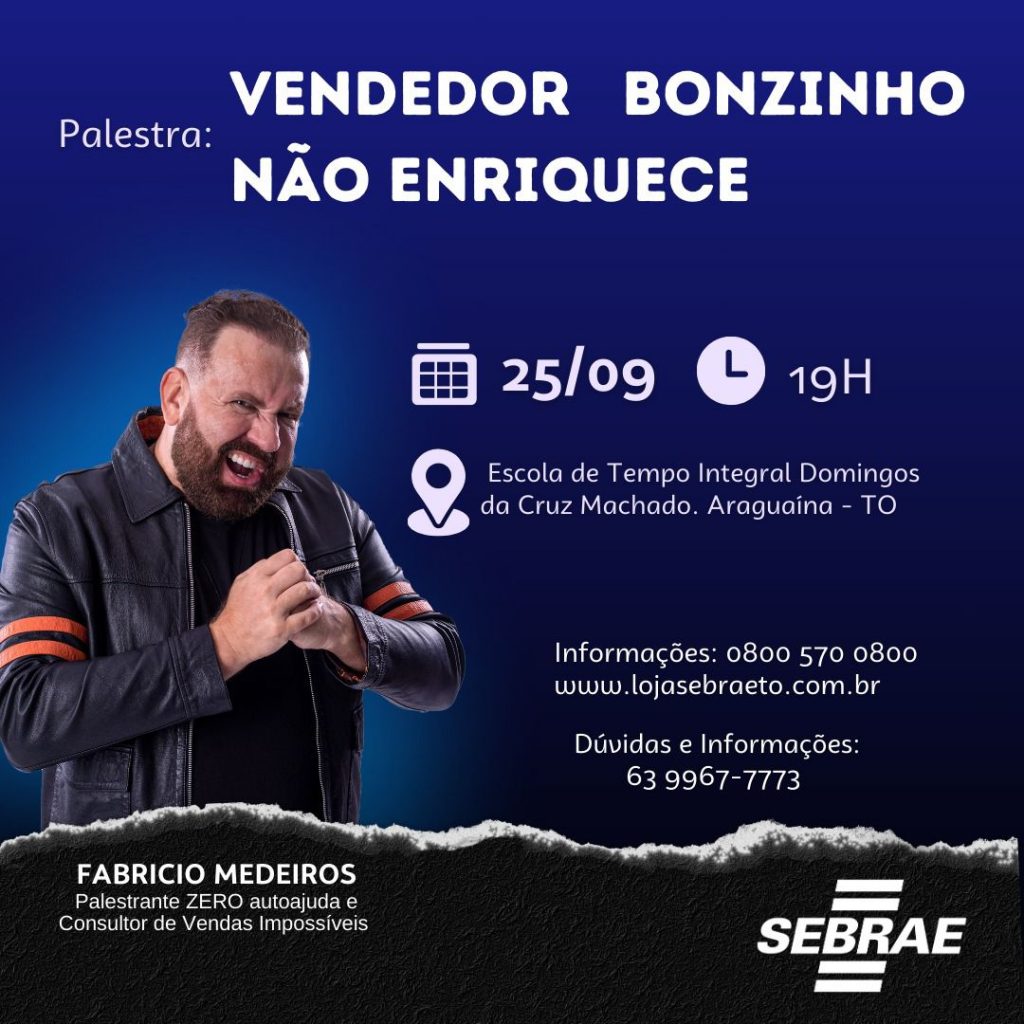 Pensando nos profissionais de vendas, gestores, empresários e empreendedores que buscam aprimorar suas habilidades, o Sebrae Tocantins promove em Araguaína, norte do Estado, a palestra “Vendedor bonzinho não enriquece”. A ação, que ocorre no dia 25 de setembro, às 19 horas, na Escola de Tempo Integral Domingos da Cruz Machado, tem o objetivo de ensinar estratégias avançadas de gestão para que os participantes possam alcançar resultados no mercado.