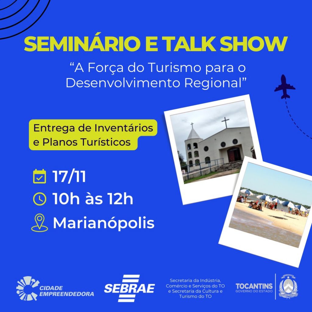 Para apresentar as comunidades turísticas tocantinenses o Inventário de Turismo e os Planos Estratégicos Turísticos dos municípios, o Sebrae Tocantins realizará em Palmas, Araguaína, Gurupi e Marianópolis, o seminário “A Força do Turismo para o Desenvolvimento Regional”. Em cada oportunidade serão apresentadas estratégias para o desenvolvimento local do setor. Os encontros contam com a parceria das secretarias da Indústria, Comércio e Serviços (Sics), Secretaria da Cultura e Turismo (Sectur) e prefeituras.