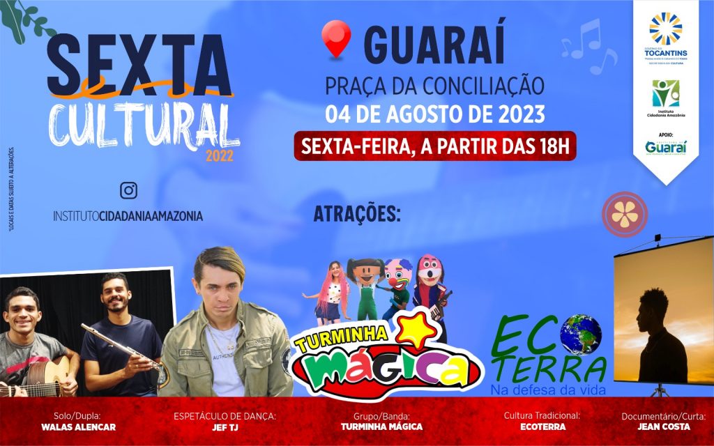 A Secretaria da Cultura (Secult), em parceria com o Instituto Cidadania Amazônia, realiza nesta sexta-feira, 04, no município de Guaraí, mais uma edição do projeto Sexta Cultural. O evento acontecerá na praça da Conciliação, a partir das 18 horas, e contará com cinco atrações artísticas, que se apresentarão gratuitamente para a população.