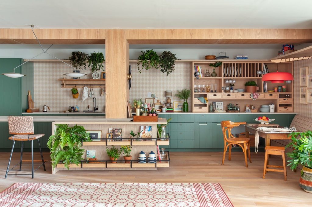 Com uma área de 120M², o ambiente abrange uma variedade de espaços incluindo living, varanda, cozinha/copa, dormitório, escritório, closet e banheiro, onde podemos encontrar peças de decoração da linha Paradiso da SOUQ. A coleção traz peças delicadas com atenção aos detalhes, em total sintonia com os ambientes acolhedores criados por Cacau. Essas peças trazem referências boho chic, com aplicações exclusivas, como as estampas sicilianas, além de padronagens geométricas e jacquards florais, aplicadas em peças como bowls, jarras, moringas, castiçais, pratos e toalhas de mesa.