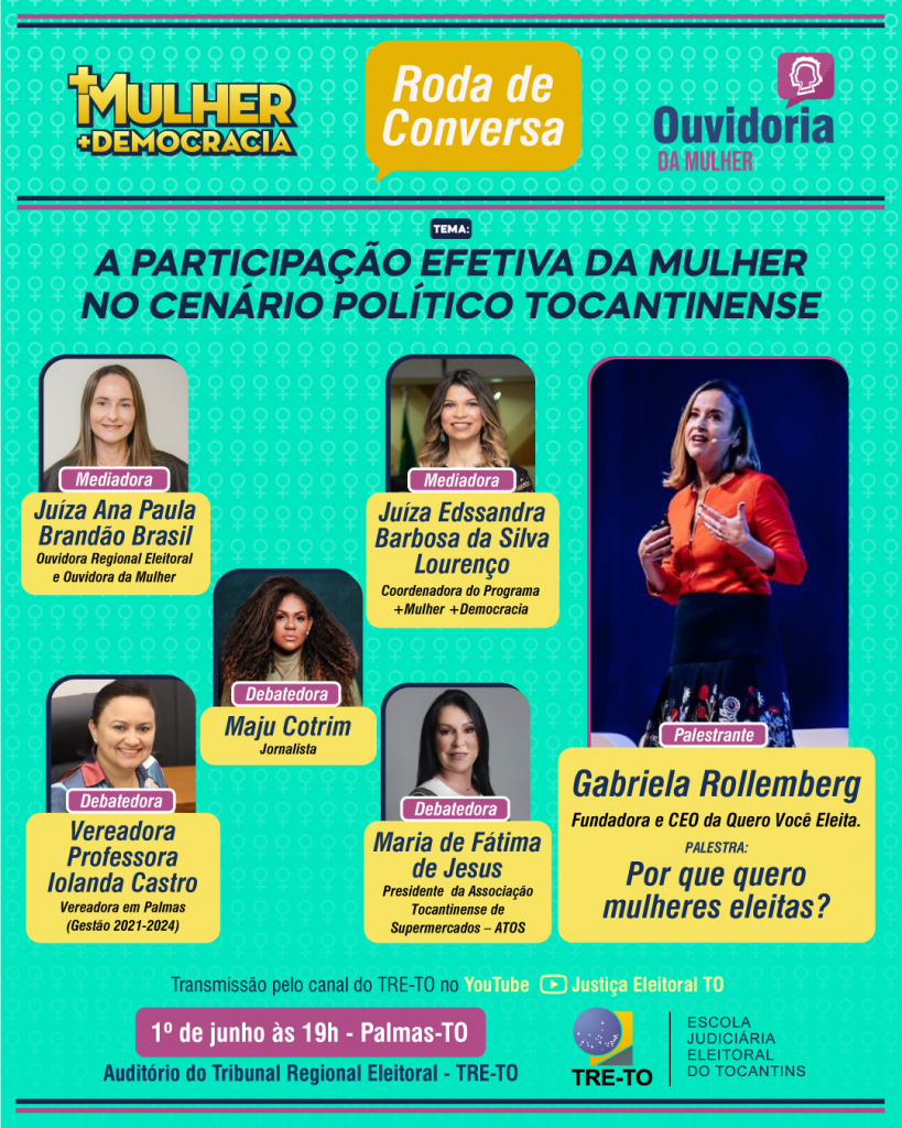 Dia 1º de junho, quinta-feira, é a vez da capital Palmas receber ações do programa permanente + Mulher + Democracia, que acontece no auditório do Tribunal Regional Eleitoral do Tocantins (TRE-TO), com início às 19 horas e transmissão ao vivo pelo canal do TRE-TO no YouTube. Esta é uma iniciativa do tribunal, por meio da Escola Judiciária Eleitoral (EJE), e da Ouvidoria da Mulher.
