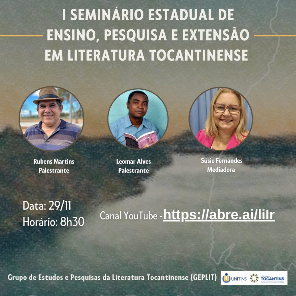 A Universidade Estadual do Tocantins (Unitins) realiza, no dia 29 de novembro, I Seminário Estadual de Ensino, Pesquisa e Extensão em Literatura Tocantinense. O evento é organizado pelo Grupo de Estudos e Pesquisas da Literatura Tocantinense (Geplit) e pela coordenação do projeto de pesquisa “Literatura Tocantinense: da gaveta, à web e ao leitor”. A programação acontece nos períodos matutino e noturno, em formato on-line, com transmissão de quatro mesas-redondas. A programação é destinada a estudantes, professores, pesquisadores, escritores e interessados por literatura.